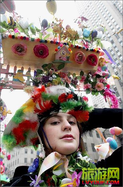 3月27日,許多身著奇裝異服、頭戴大花帽的紐約人聚集在美國紐約第五大道,參加一年一度的復活節大游行。